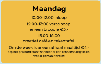 Elke maandag vanaf 10:00-16:00 inloop in de ochtend gezellig kletsen, er is lunch tegen betaling van 12:00-13:00 daarna is er creatief cafe of...